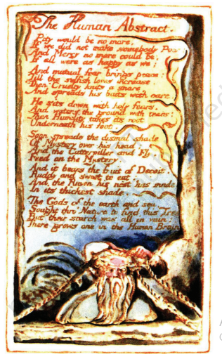 Note: Blake’s poetry was published in a manner most unusual in literature and art history; he manufactured each copy. The verses were not typeset but were, with the engravings that illustrated them, cut into copper plates. The pages themselves were illuminated in water colours. Thus, Blake can be called the first multi-media artist.