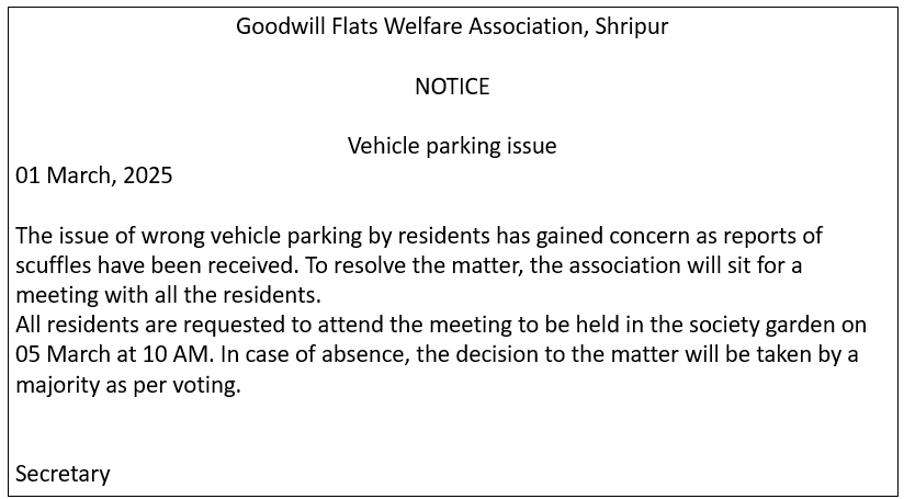 Q1. The problem of the residents’ parking of vehicles, often leading to minor scuffles, has become a source of growing concern. As Secretary of Goodwill Flats Welfare Association, Shripur, write a notice informing the residents about a meeting to discuss the problem and find an acceptable solution. Invent necessary details.  [CBSE, 2024]