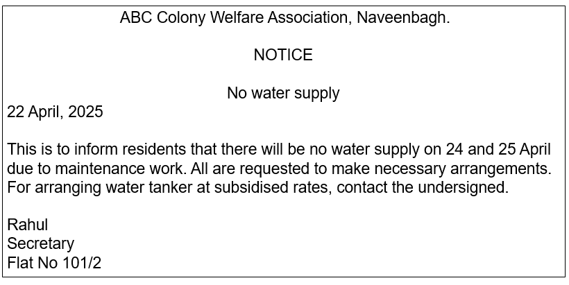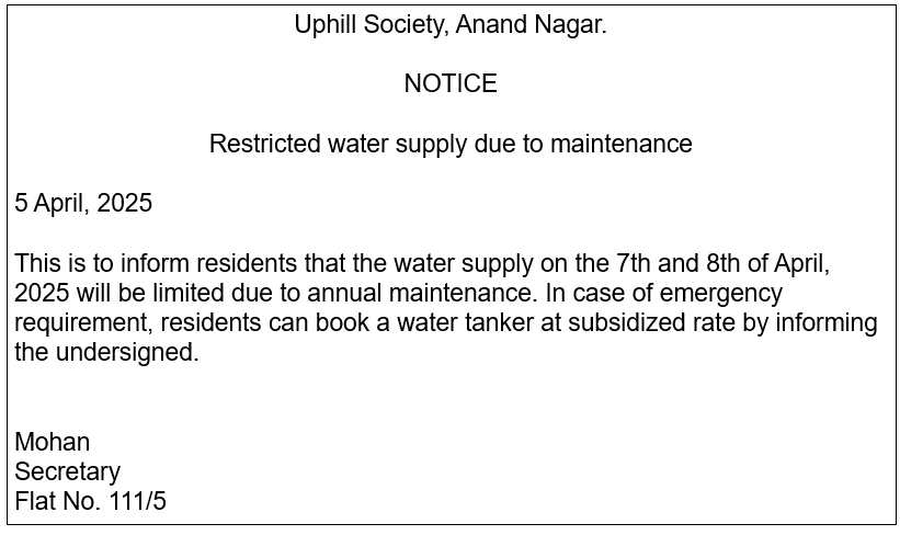 Q10. Write a notice informing the residents about the limited water supply on the 7th and 8th of April, 2024 due to annual maintenance. Inform them of the availability of tankers at a subsidised cost in case of an emergency. You are Meera/Mohan, Secretary of Uphill Society, Anand Nagar.  [CBSE, 2024]