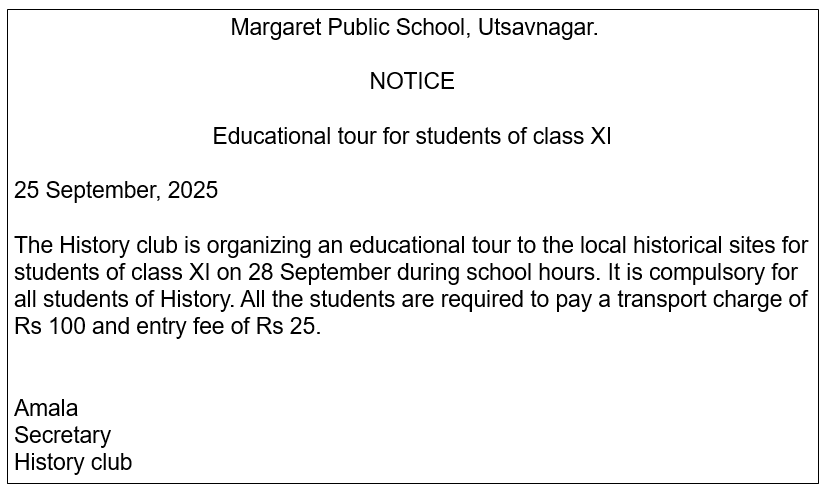 Q11. You are Akhil/ Amala, the Secretary of the History Club of Margaret Public School, Utsavnagar. The club has decided to conduct an educational tour to the local historical sites for students of class XI. Draft a notice informing the students of the proposed tour. Invent all necessary details.  [CBSE, 2024]