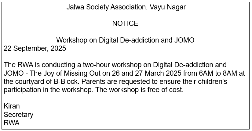 Q13. The RWA is organizing a two-hour workshop on Digital De-addiction and JOMO – The Joy of Missing Out. Draft a notice informing residents about it and requesting them to attend, along with their children. Invent necessary details. You are Kiran/Krishna, Secretary of the RWA.   [CBSE, 2024]