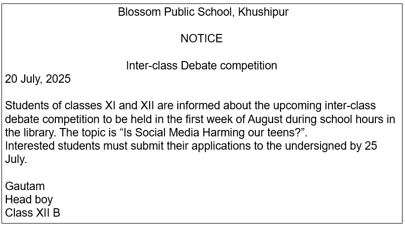 Q14. You are Geeta/Gautam, the Head girl/Head boy of Blossom Public School, Khushipur. Write a notice in about 50 words, informing the students of classes XI and XII about an inter-class debate competition to be held in the school in the first week of August. Invite applications for the same. Invent necessary details.  [CBSE, 2024]
