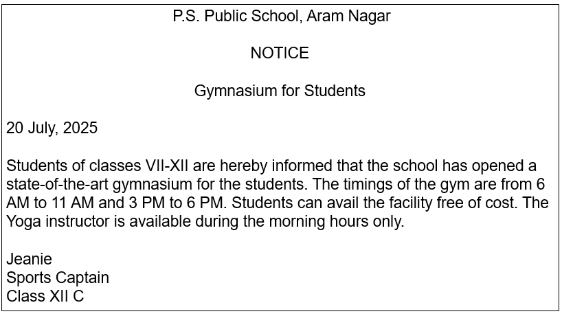 Q16. P.S. Public School, Aram Nagar has opened a gym for the benefit of students. As Sports Captain, draft a notice informing students about the facilities available in the gym, timings and other details. [CBSE, 2024]