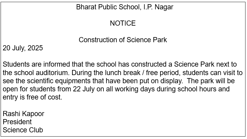 Q19. Bharat Public School, I.P. Nagar, has recently constructed a Science Park, a dedicated area where specific equipments based on principles of science are setup. As Rashi Kapoor, President of Science Club, draft a notice for the school notice board, informing students of the same. Mention relevant details.   [CBSE, 2024]