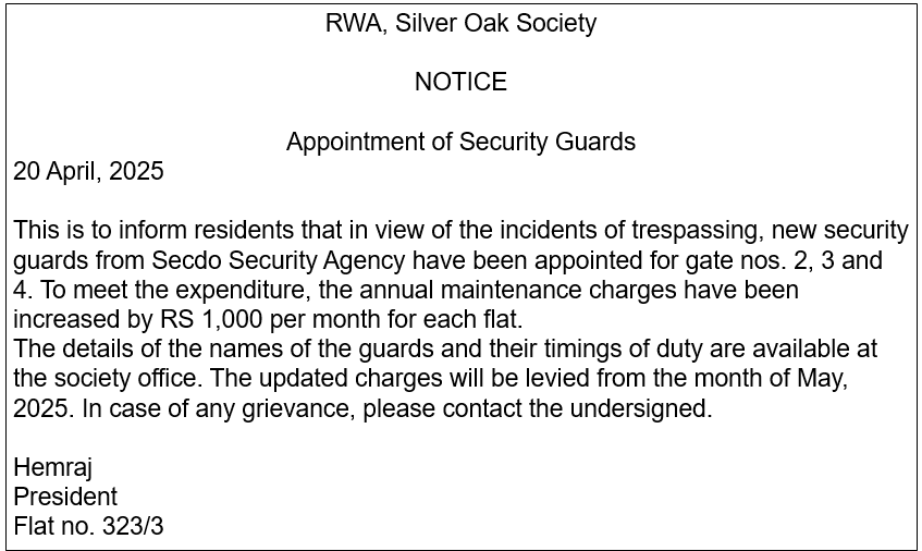 Q20. You are the President, RWA Silver Oak Society. Draft a notice for the society notice board informing residents about the appointment of security guards at Gate Nos. 2, 3 & 4 and an increase of Rs.1,000 in the annual maintenance charges to meet the expenditure. Mention relevant details.    [CBSE, 2024]