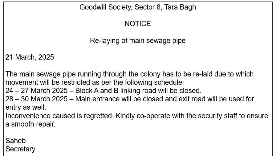 Q3. Write a notice to inform the house owners in your society about re-laying of the main sewage pipe running through the colony. Mention the temporary restrictions and the duration of the maintenance work. You are Saheb/Sahiba, Secretary, Goodwill Society, Sector 8, Tara Bagh.  [CBSE, 2024]