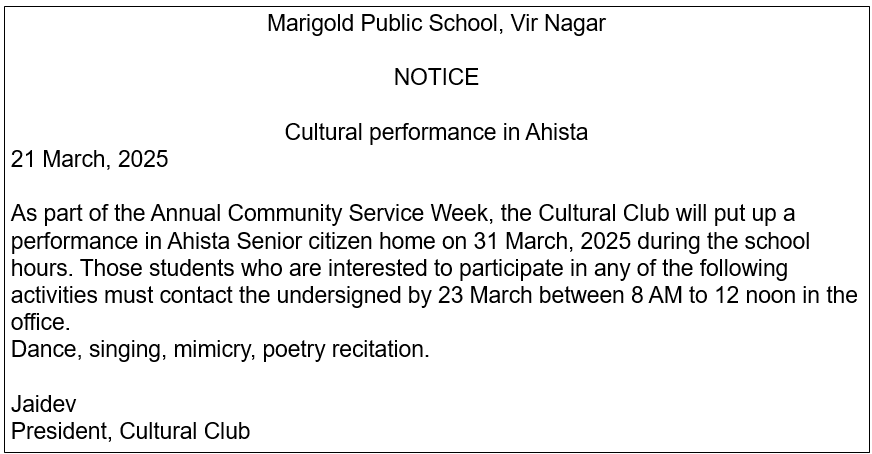 Q4. You are the President of the Cultural Club of Marigold Public School, Vir Nagar. As part of the Annual Community Service Week, you are planning to put up a cultural performance in ‘Ahista’, a  senior citizens home. Draft a notice for the school notice board inviting participation by the students. Invent necessary details.     [CBSE, 2024]