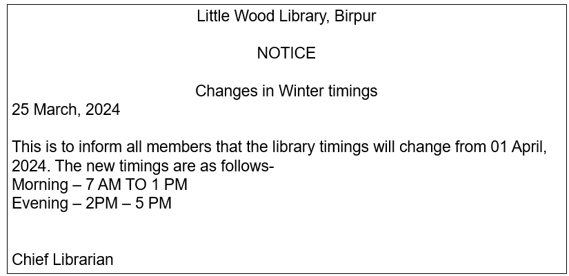 Q5. As Chief Librarian of Little Wood Library, Birpur, draft a notice informing members about the change in winter timings, effective from 1st April, 2024. Also inform the members about the newly introduced electronic international journal support service with a remote accessing facility. Invent necessary details.    [CBSE, 2024]