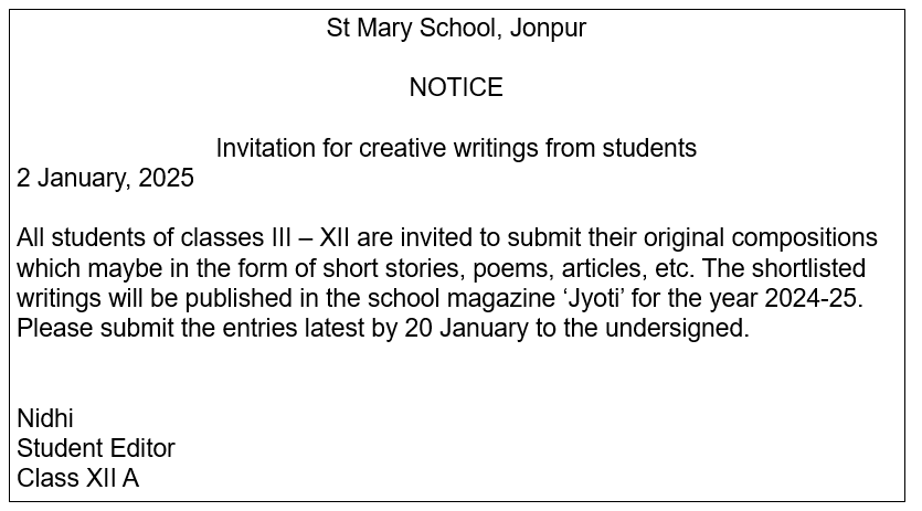 Q6. You are Nidhi/Nihal, student editor of your school magazine ‘Jyoti.’ Write a notice for the school notice board inviting short stories, poems, articles, etc. from students of all classes for the school magazine. Invent all necessary details.     [CBSE, 2024]