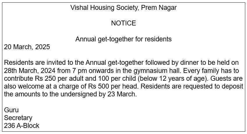 Q7. You are Secretary of Vishal Housing Society, Prem Nagar. Draft a notice for the society notice board informing and inviting residents to the annual get-together to be held in the society compound, followed by dinner, on 28th March, 2024 from 7 pm onwards. Invent other details like contribution per family, guest charges, etc.   [CBSE, 2024]