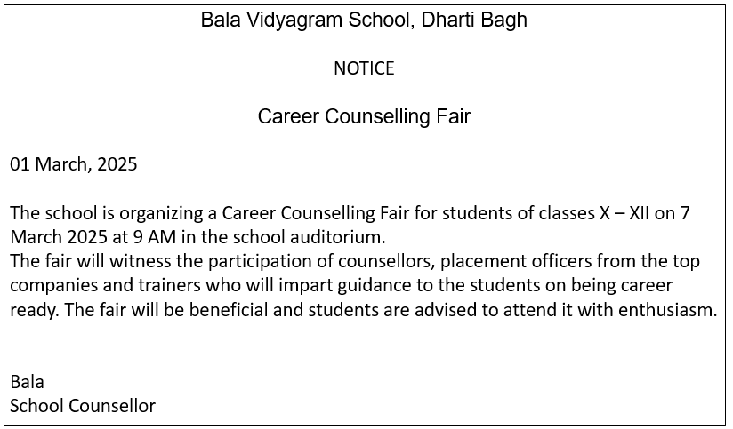 Q8. You are Bala/Bandhini, school counsellor of Bala Vidyagram School, Dharti Bagh. Your school is organising a Career Counselling Fair. Write a notice encouraging students to attend the fair. Mention the benefits and include necessary details.  [CBSE, 2024]