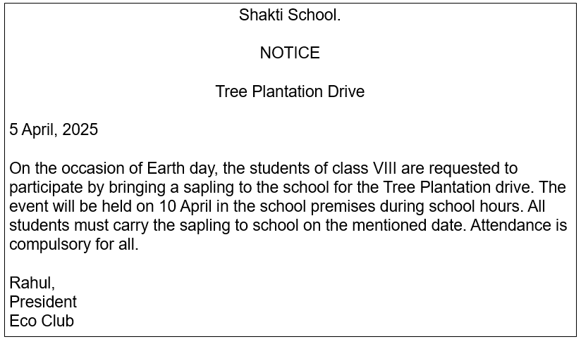 Q9. Write a notice for the school notice board requesting Class 8 students to participate in the Earth Day celebrations by each bringing a sapling to school for the Tree Plantation Drive in school. Invent necessary details. You are Radha/Rahul, President of the Eco Club, Shakti School.  [CBSE, 2024]
