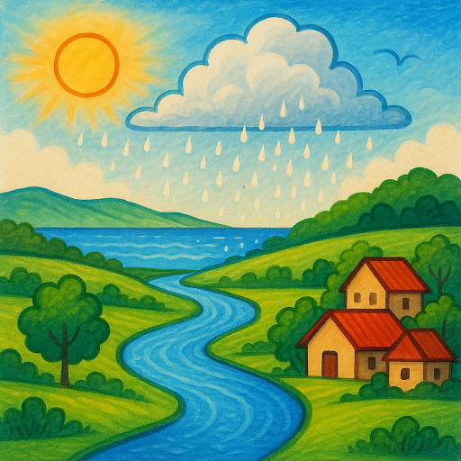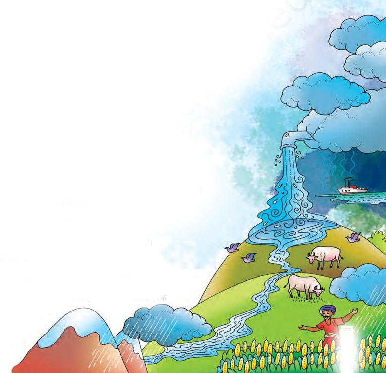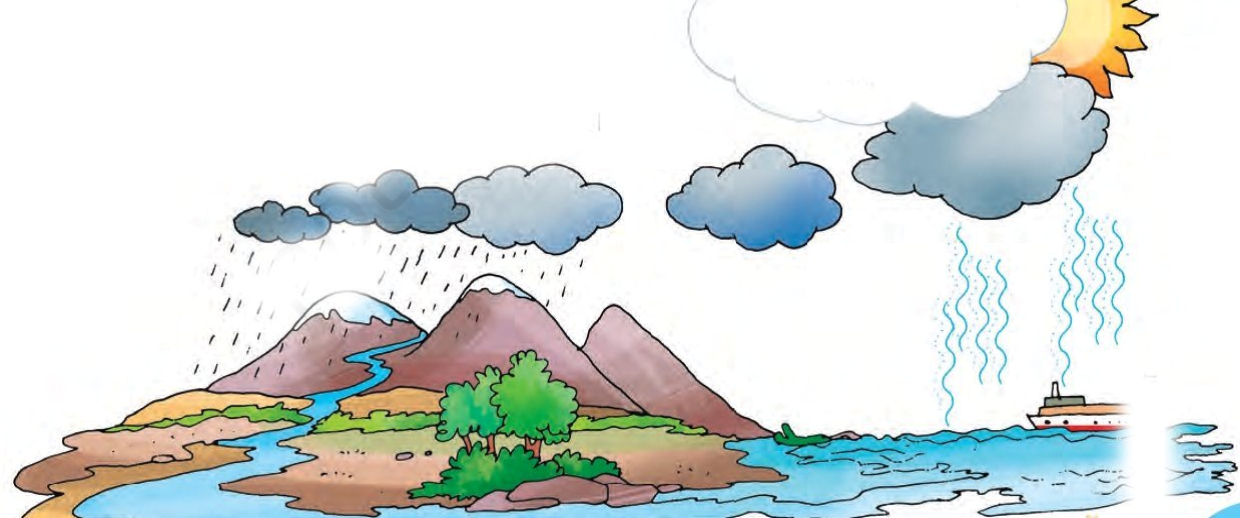 | 3. जल–चक्र | 4. समुद्र से उठी भाप का बादल बनकर पानी में बदलना और वर्षा के द्वारा समुद्र में मिल जाना। |
