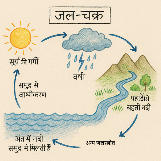 उत्तर- जल-चक्र पानी के प्राकृतिक संचरण की प्रक्रिया है जिसमें सूर्य, समुद्र, भाप, बादल, हवा, धरती और वर्षा शामिल होते हैं। यह चक्र समुद्र से भाप के उठने से शुरू होता है, फिर वह बादल बनती है और वर्षा के रूप में धरती पर गिरती है। नदी बनकर पानी पुनः समुद्र में मिल जाता है। यह प्रक्रिया बार-बार चलती रहती है और पृथ्वी पर जल संतुलन बनाए रखती है।