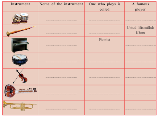 1. Look at the pictures of musical instruments and write their names; what the player of the instrument is called and a famous player of the instrument.