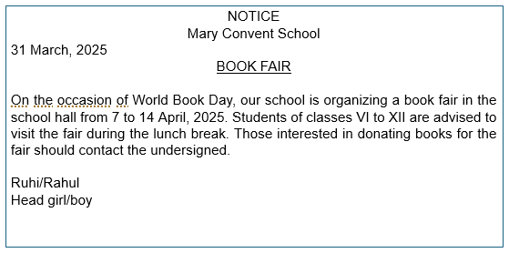 1. You are the Head of the Literature Club in your school. Write a notice informing the students that a book fair is being organised on the occasion of the World Book Day under 50 words.