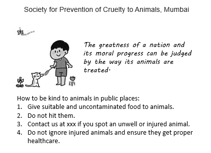 Q10. Prepare a poster in not more than 50 words on kindness to animals to be displayed in the city at public places appealing to people to show kindness to animals. You are Secretary of the Society for Prevention of Cruelty to Animals, Mumbai.