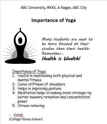 Q6. You are a fitness trainer in a college. Design a poster in not more than 50 words, to be put up on the college notice board, to emphasise the importance of yoga in maintaining mental and physical fitness. You are Vishal / Vishali.
