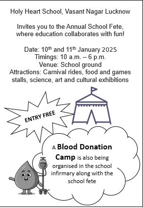 Q8. You are the school captain at Holy Heart school, Vasant Nagar Lucknow. Your school is organising a two-day fete and blood donation camp. Prepare a poster for the same, including all essential details.