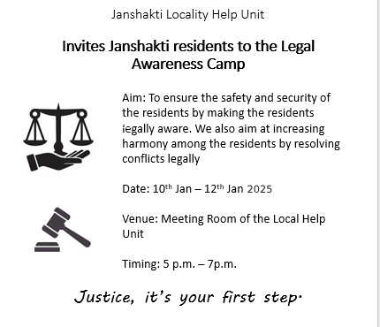Q9. You are the Secretary of the local legal help unit of Janshakti. Prepare a poster to be put up outside the office, creating awareness and inviting residents to the legal awareness camp being organised at the unit. Include necessary details about the event.